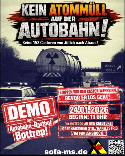Im Vorfeld der für Samstag, den 24. Januar, geplanten Demonstration gibt es einen Streit vor dem Verwaltungsgericht Gelsenkirchen. Die Demonstration richtet sich gegen die angekündigten 152 Atommülltransporte vom Forschungszentrum Jülich nach Ahaus. Sie beginnt um 11 Uhr am Autobahn-Rasthof Bottrop-Süd.